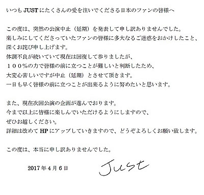 4月8日(土曜日)クラップス六本木にて開催を予定しておりました「JUSTバースデーコンサート」は諸事情により、
